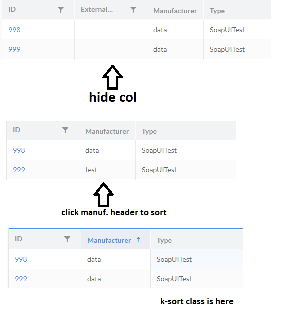2. [Correct] The Manufacturer table header gets the 'k-sorted' class, making it blue, showing an arrow