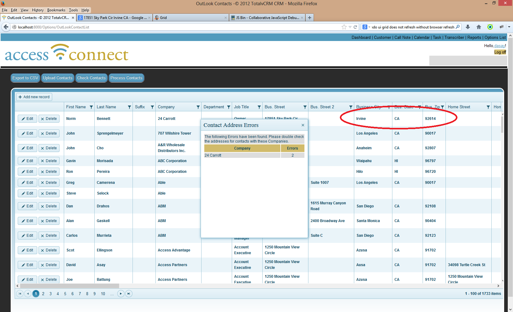 I have a grid that I am using to manage outlook contacts. This data grid is using inline editing to make edits to the contacts. I also have a button on the page that reads the contacts from the database and checks for address errors. The issue is that the update does not propagate to the database until I force a browser refresh. The goal is to make changes then check the contact addresses without having to leave the page or force a browser refresh.