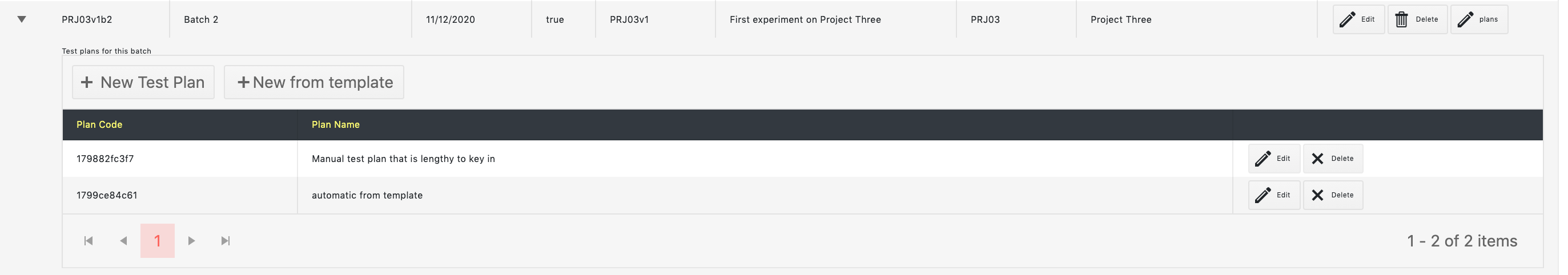 I have a grid of "batches" with nested "test plans".