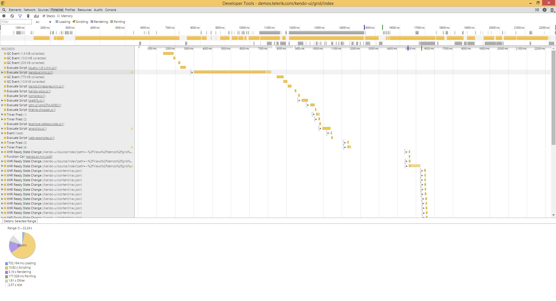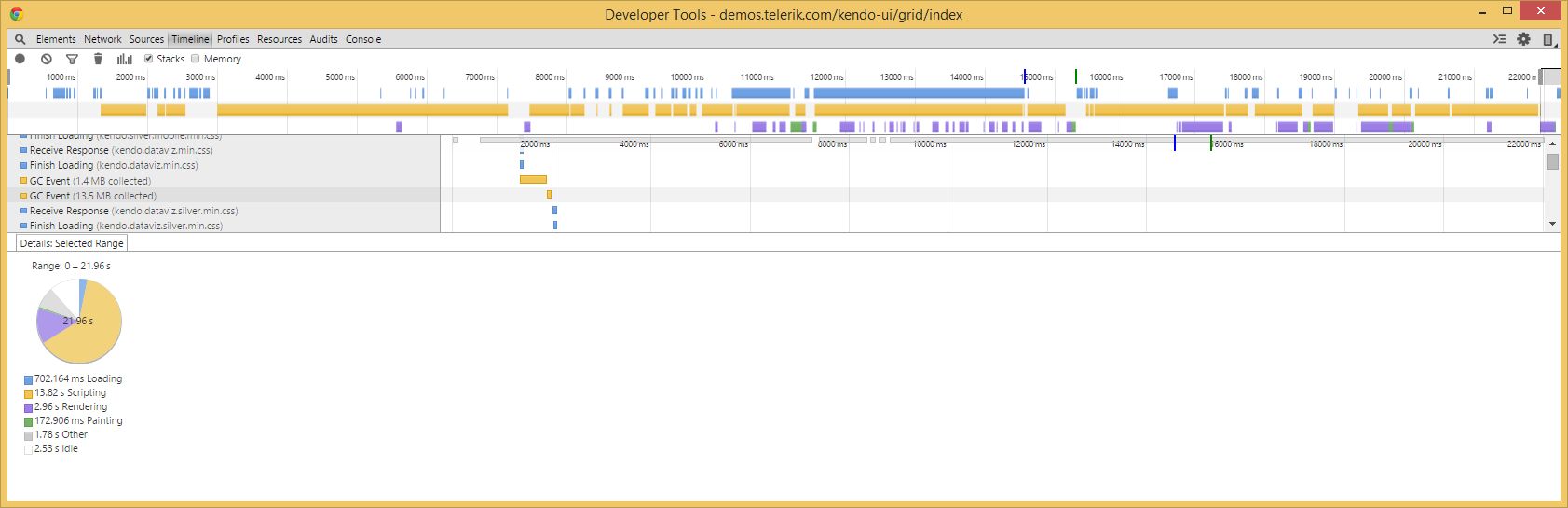 In fact, I've tried that on the grid demo page (http://demos.telerik.com/kendo-ui/grid/index), using Chrome browser, and most time is consumed by "scripting"; with big chunks of it being unexpected GC events and evaluating scripts - check the files attached .