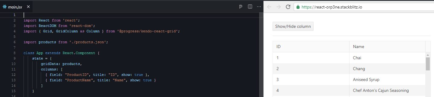 I try to make show/hide column similar to this React (forked) - StackBlitz using checkboxes.