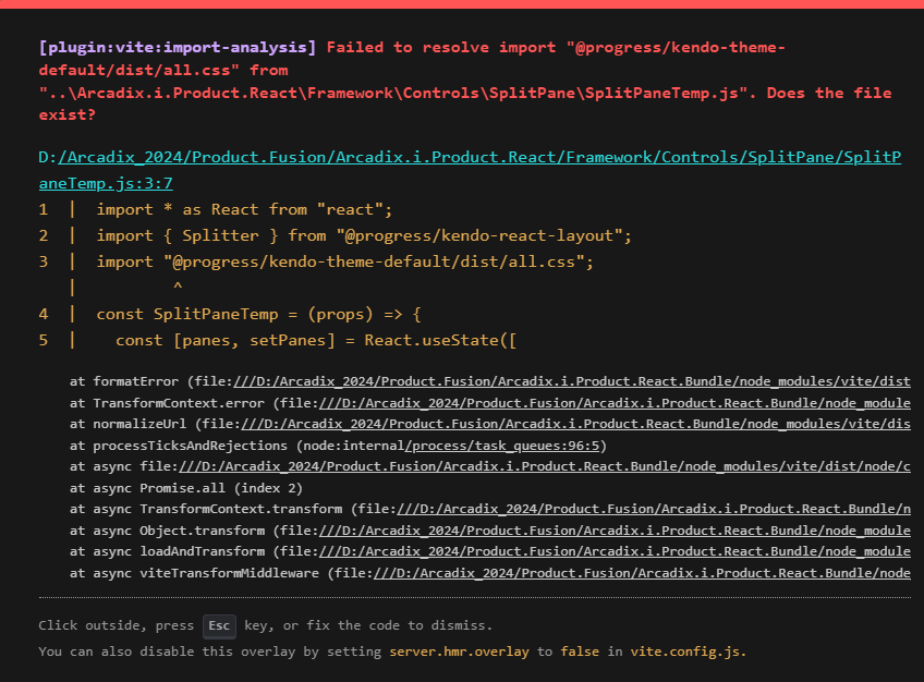 Failed to resolve import "@progress/kendo-theme-default/dist/all.css" from "..\Arcadix.i.Product.React\Framework\Controls\SplitPane\SplitPaneTemp.js".
