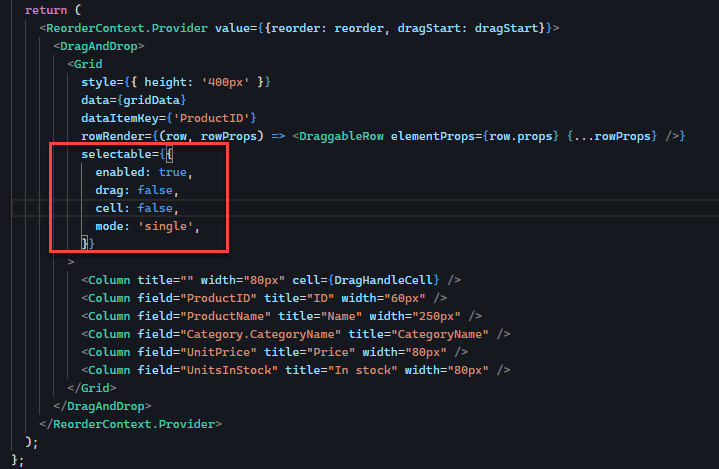 I try to implement drag drop row and selection row in datagrid, So I try your demo code https://www.telerik.com/kendo-react-ui/components/grid/rows/row-reordering/.