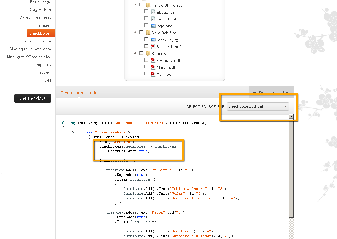 @(Html.Kendo().TreeView() .Name("Blah") .Checkboxes( checkbox => { }) .DataSource( dataSource => { }) )Also, it seems that the datasource for checkboxes.cshtml and checkboxes.html examples on the demo site, are different.