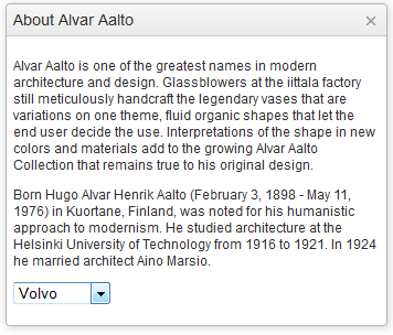 <select> <option value="volvo">Volvo</option> <option value="saab">Saab</option> <option value="mercedes">Mercedes</option> <option value="audi">Audi</option></select>Reproduced in any kendo ui window.