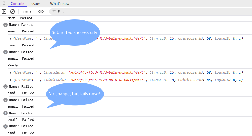 This validates the user input and usually works correctly. Once data is entered, I check the validator before submitting:
