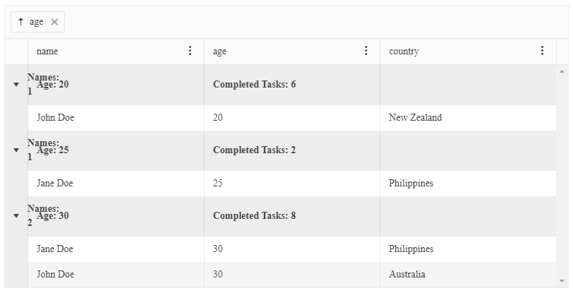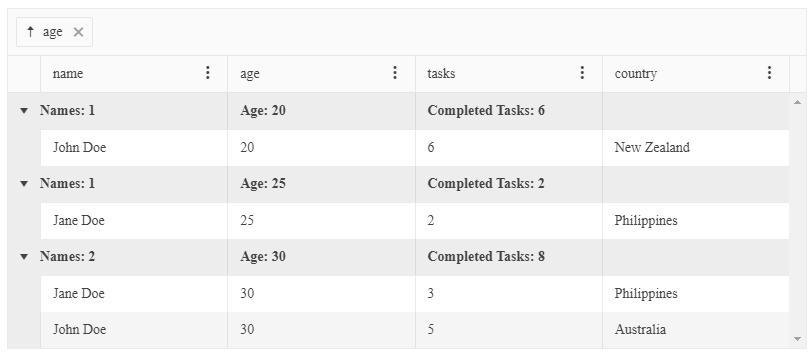 But once you do edit the layout (e.g., hiding the tasksCompleted column) of the grid, the groupHeaderTemplate no longer works properly. As is expected because the column or table td's are defined and fixed.