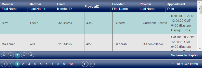 schema: { model: { fields: { ReportDate: { type: "date" }, Age: { type: "number" } } }}//make first column a link using values from two columnscolumns[0].template = "<a href='somepage.html?rid=#=ReportID#' target='_blank'>#=ReportNum#</a>";//make sure value in 3rd column is formatted as a datecolumns[2].format = "{0:M/d/yyyy h:mm tt}";var orderViewModel = kendo.observable({ orderList: orderDS, showOrderDetail: function(e) { var view = e.view; orderDS.fetch(function() { var model = view.model, item = orderDS.get(view.params.id); model.set("order", item) }); }});<div id="orderDetail" data-role="view" data-layout="mobile-tabstrip" data-title="Orders" data-model="orderViewModel" data-show="showOrderDetail"> <p data-bind="text: order.total"></p></div><div id="servicerLeadFlow" data-role="view" data-title="Adjust Lead Flow" data-show="mobileLeadFlowDataBind" style="display:none"> <ul id="leadFlowBtnGroup1" data-role="buttongroup" data-index="0" data-select="servicerLoadGroup"> <li>A-E</li> <li>F-J</li> <li>K-O</li> <li>P-T</li> <li>U-Z</li> </ul> <ul data-role="listview" data-style="inset"> <ul id="servicerLeadFlowView"></ul> </ul> <ul id="leadFlowBtnGroup2" data-role="buttongroup" data-index="0" data-select="servicerLoadGroup"> <li>A-E</li> <li>F-J</li> <li>K-O</li> <li>P-T</li> <li>U-Z</li> </ul></div><div id="listCompanyPackages" data-role="view" data-title="Company Packages" data-show="mobileCompanyPackageDataBind" style="display:none"> <div id="divShowCompany2"></div> <ul data-role="listview" data-style="inset"> <ul id="companyPackageView"></ul> </ul></div>function servicerLoadGroup() { servicerGroup = this.current().index(); var view; if (sevicerViewShown) { view = $("#servicerOnOff").data("kendoMobileView"); setServicerGroupIndex(); } if (leadFlowViewShown) { view = $("#servicerLeadFlow").data("kendoMobileView"); setLeadFlowGroupIndex(); } var scroller = view.scroller; scroller.reset(); dsCompany.read();}View