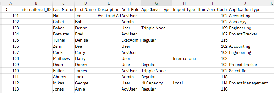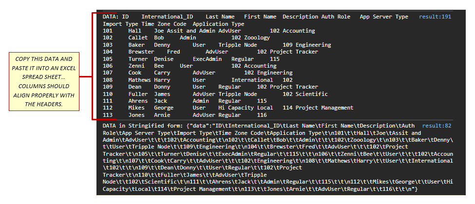 DATA in stringified form: {"data":"ID\tInternational_ID\tLast Name\tFirst Name\tDescription\tAuth Role\tApp Server Type\tImport Type\tTime Zone Code\tApplication Type\t\n101\t\tHall\tJoe\tAssit and Admin\tAdvUser\t\t\t102\tAccounting\t\n102\t\tCallet\tBob\t\tAdmin\t\t\t102\tZooology\t\n103\t\tBaker\tDenny\t\tUser\tTripple Node\t\t109\tEngineering\t\n104\t\tBrewster\tFred\t\tAdvUser\t\t\t102\tProject Tracker\t\n105\t\tTurner\tDenise\t\tExecAdmin\tRegular\t\t115\t\t\n106\t\tZenni\tBee\t\tUser\t\t\t102\tAccounting\t\n107\t\tCook\tCarry\t\tAdvUser\t\t\t102\tEngineering\t\n108\t\tMathews\tHarry\t\tUser\t\tInternational\t102\t\t\n109\t\tDean\tDonny\t\tUser\tRegular\t\t102\tProject Tracker\t\n110\t\tFuller\tJames\t\tAdvUser\tTripple Node\t\t102\tScientific\t\n111\t\tAhrens\tJack\t\tAdmin\tRegular\t\t115\t\t\n112\t\tMikes\tGeorge\t\tUser\tHi Capacity\tLocal\t114\tProject Management\t\n113\t\tJones\tArnie\t\tAdvUser\tRegular\t\t116\t\t\n"}