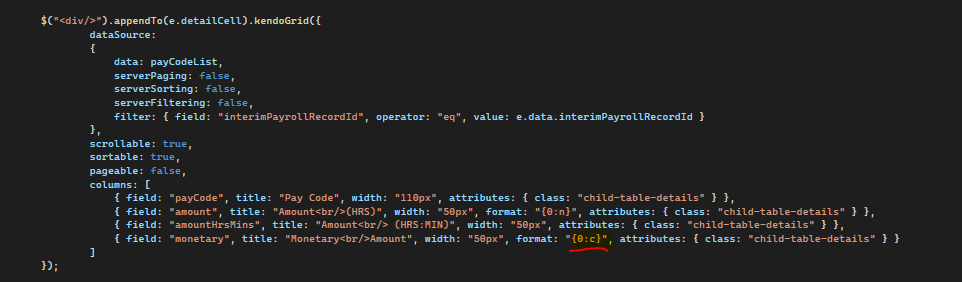{ field: "monetary", title: "Monetary<br/>Amount", width: "50px", format: "{0:c}", attributes: { class: "child-table-details" } }