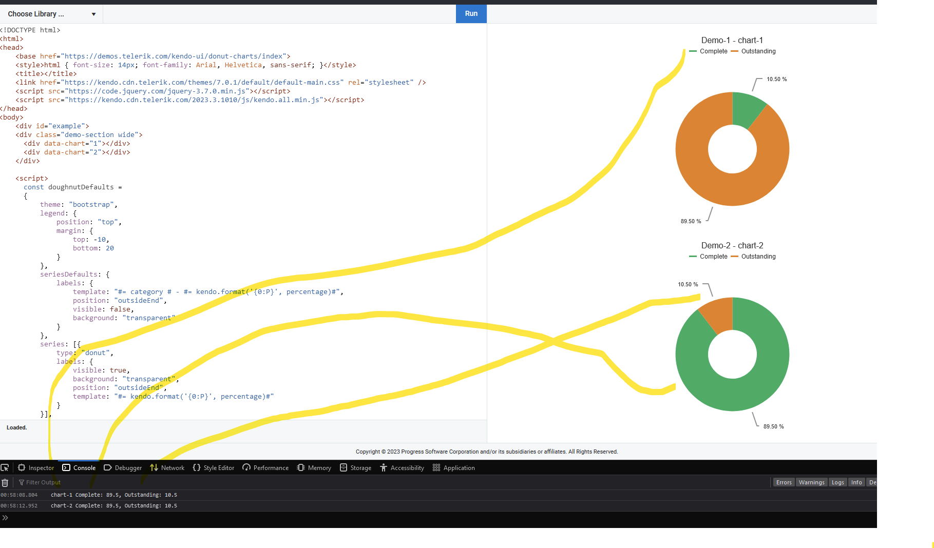 i.e Click on Complete on "Demo-1 - chart-1" legend and in the Console it will output the values for chart two instead (if i didn't have the preventDefaults, it would also update Demo-1 as Demo-2 value)