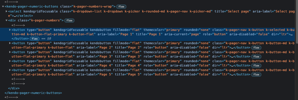 checking with the working demo from the kendo page the pager as rendered as buttons instead of li and there is a class k-selected which is also defined in the theme: