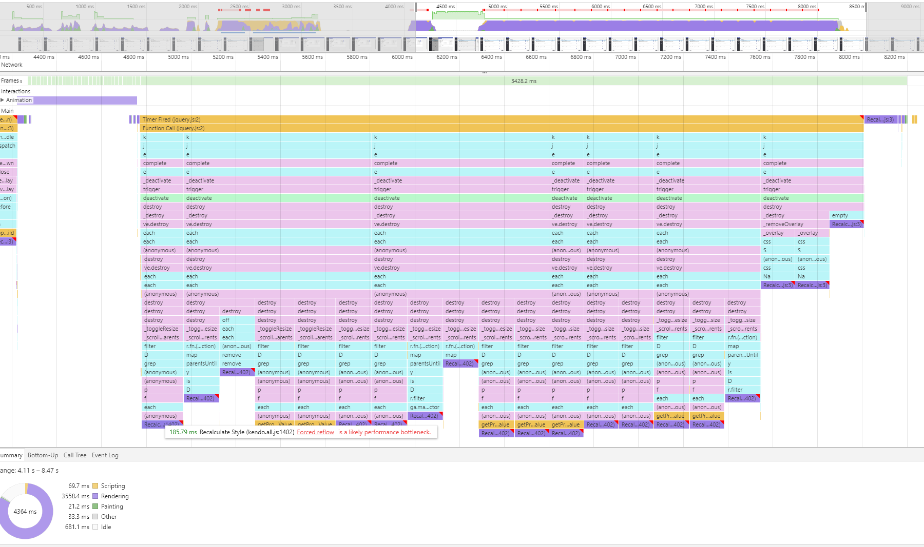 I have attached a Picture from the Chrome performance analyser - it seems there is a "Recalculate Style" in Kendo.all.js which is called often...