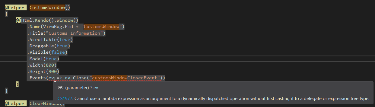 Per screenshot below: I have used events in Kendo Window this way many times before, and I don't understand why I'm getting the syntax error below. Can anyone help, please?