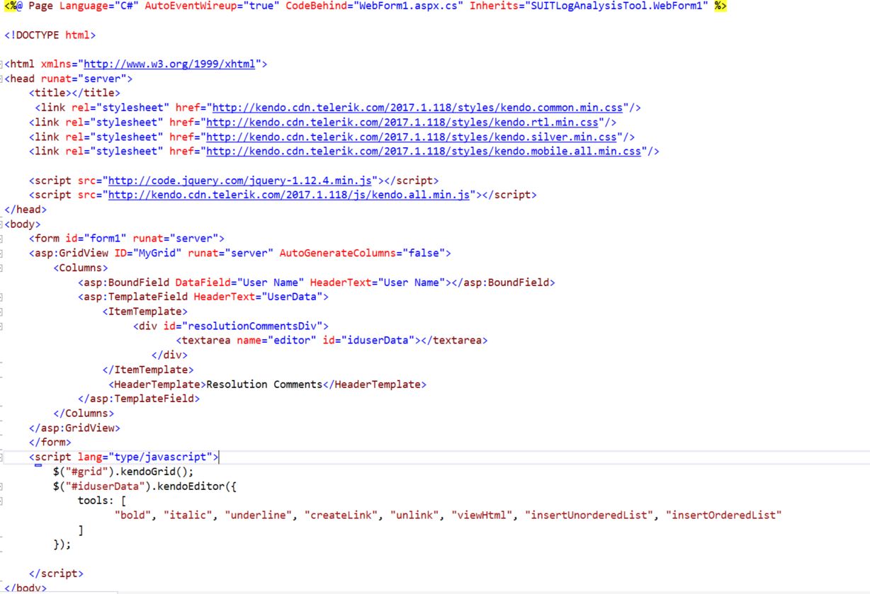 I have a aspgrid for which i am applying kendo grid ui. There are 2 columns in the grid, 1. BoundField 2. TemplateField in which i want to show KendoEditor control.