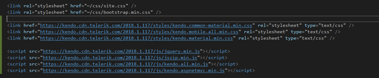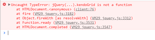 I am trying to set up a kendo grid for my asp.net core application but running into 'kendoGrid is not a function' error. Please see attached snap shot for the error and script references that i have included in my file.