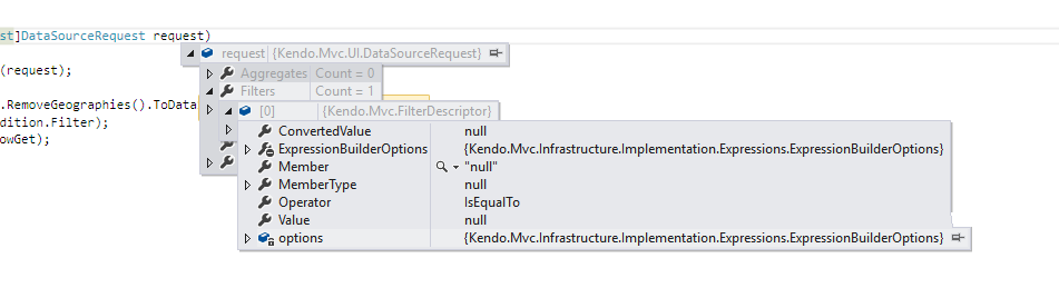 And your "Operator used in FilterDescriptor" keys has IsNull operator