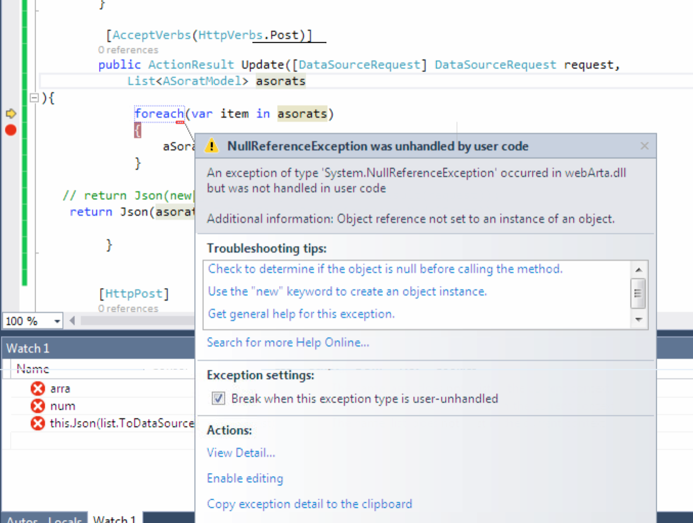 yet when we try to update the data inside the Grid the Update method will get null value for it's second argument (IEnumerable<ASoratModel> asorats) but when we omit the IEnumerable<T> we only get one item.