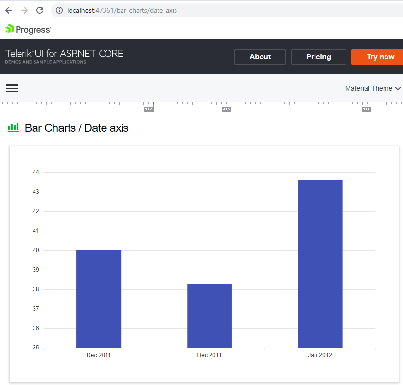 @(Html.Kendo().Chart(Model).Name("chart").Series(series =>{ series .Column(model => model.Value, categoryExpression: model => model.Date) .Aggregate(ChartSeriesAggregate.Avg);}).CategoryAxis(axis => axis .Date() .BaseUnit(ChartAxisBaseUnit.Weeks) .MajorGridLines(lines => lines.Visible(false)) .Labels(lbl => lbl.Culture("en-US").Format("MMM yyyy"))).ValueAxis(axis => axis .Numeric() .Line(line => line.Visible(false))))which will result in the following in the client-side options literal: