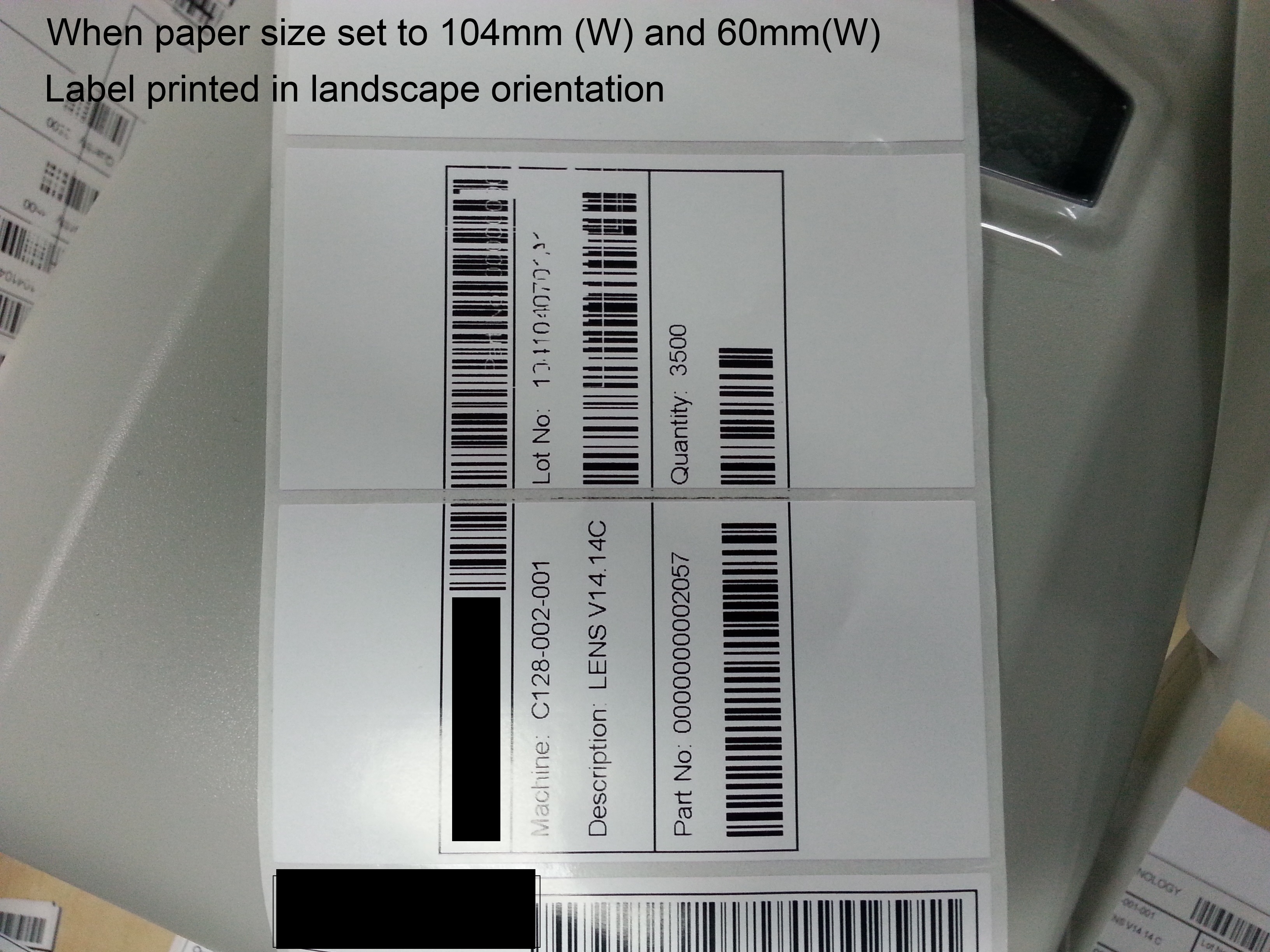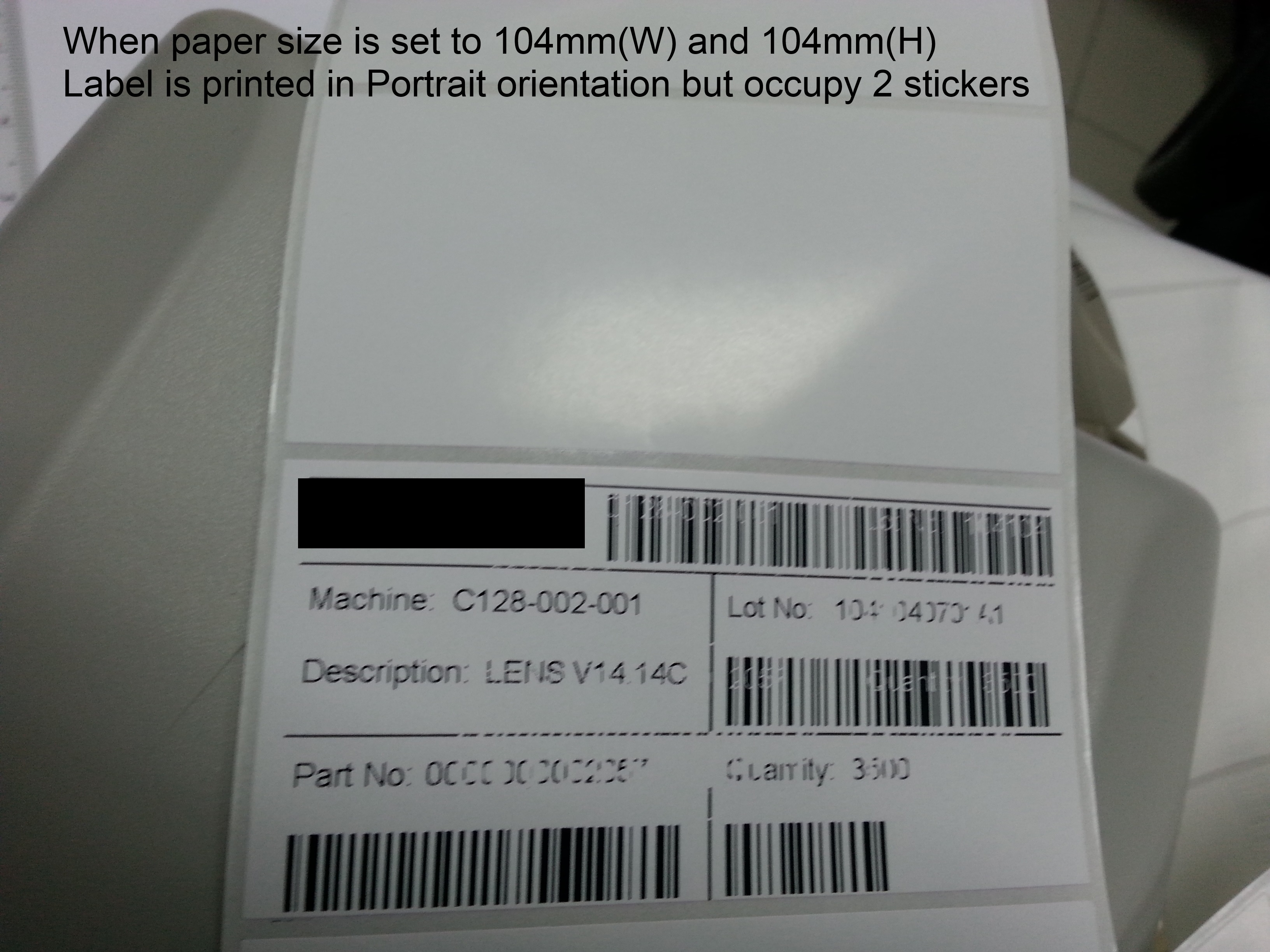 When the paper size is set to 104mm (W) and 104mm(H), the label is printed in portrait orientation. However, this is also not desirable because the printer is advancing more empty labels.