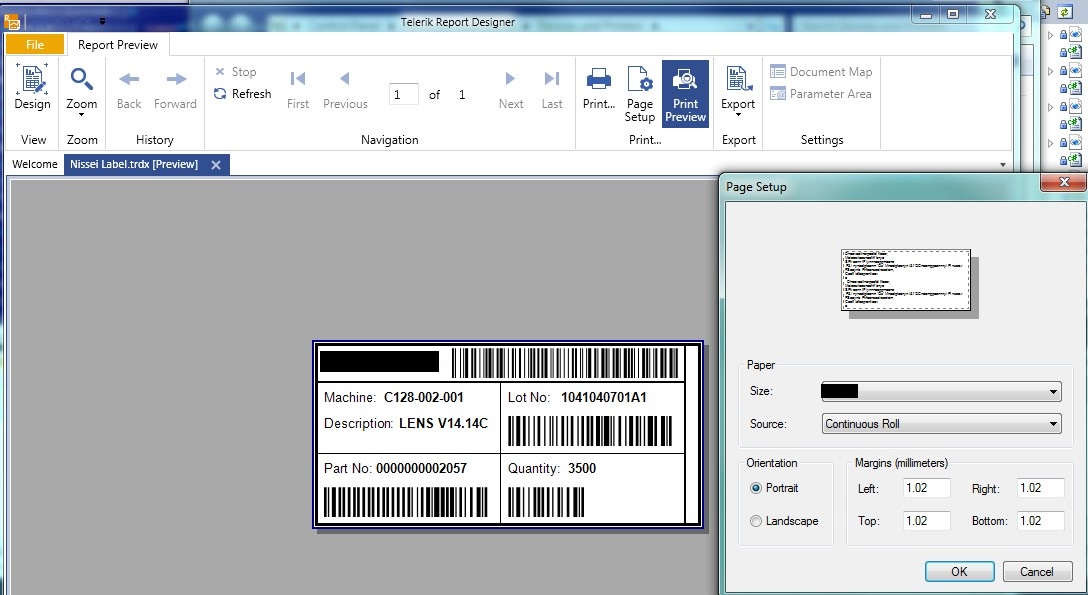 m_ReelLabel.PageSettings.PaperKind = PaperKind.Custom;m_ReelLabel.PageSettings.PaperSize = new SizeU(new Unit(104, UnitType.Mm), new Unit(60, UnitType.Mm));m_ReelLabel.PageSettings.Margins.Left = new Unit(2.0, UnitType.Mm);m_ReelLabel.PageSettings.Margins.Right = new Unit(2.0, UnitType.Mm);m_ReelLabel.PageSettings.Margins.Top = new Unit(2.0, UnitType.Mm);m_ReelLabel.PageSettings.Margins.Bottom = new Unit(2.0, UnitType.Mm);InstanceReportSource src = new InstanceReportSource();src.ReportDocument = m_ReelLabel;PrinterSettings printerSettings = new PrinterSettings();PrintController standardPrintController = new StandardPrintController();Telerik.Reporting.Processing.ReportProcessor processor = new Telerik.Reporting.Processing.ReportProcessor();processor.PrintController = standardPrintController;processor.PrintReport(src, printerSettings);6 Answers, 1 is accepted