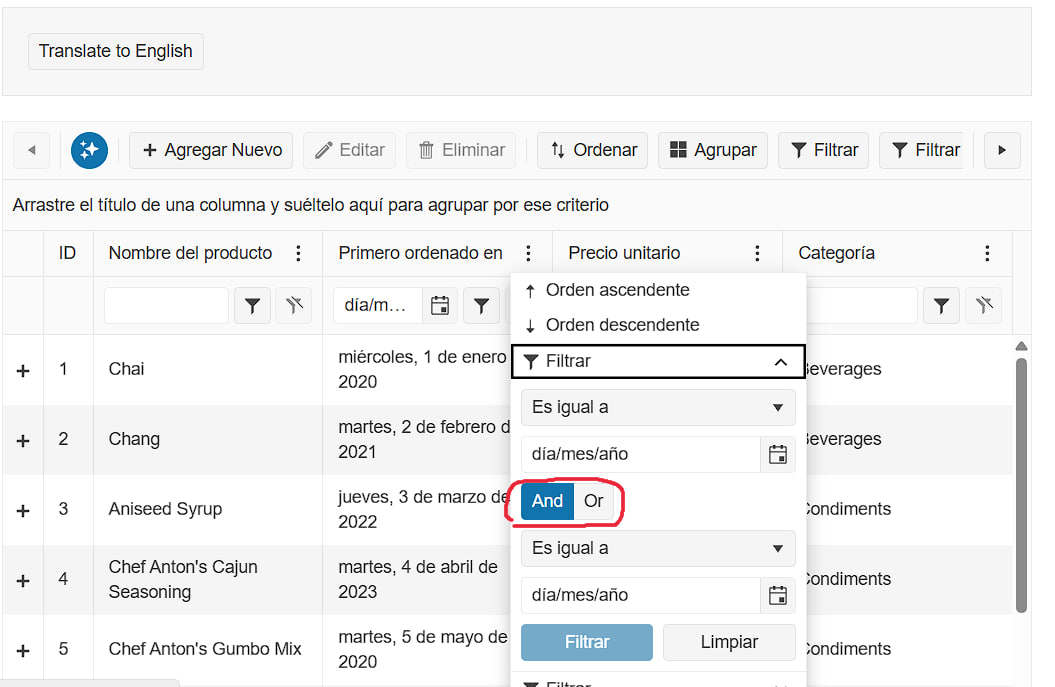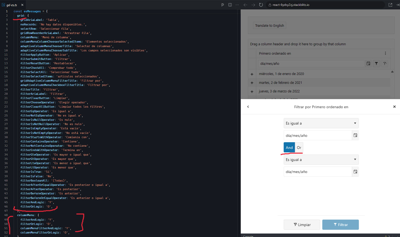 But despite the expectation that it will also be translated into Spanish, as well as filter, I see a standard text that cannot be replaced / translated by LocalizationProvider:
