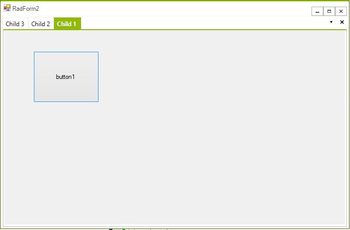 namespace TelerikWinFormsApp1{ public partial class RadForm2 : Telerik.WinControls.UI.RadForm { public RadForm2() { InitializeComponent(); this.IsMdiContainer = true; this.radDock1.AutoDetectMdiChildren = true; Form1 frm = new Form1(); // this frm is aktive frm.MdiParent = this; frm.Text = "Child 1"; frm.Show(); frm = new Form1(); frm.MdiParent = this; frm.Text = "Child 2"; frm.Show(); frm = new Form1(); // this form should be active frm.MdiParent = this; frm.Text = "Child 3"; frm.Show(); } }}
