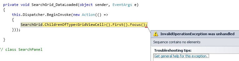 private void SearchGrid_RowLoaded(object sender, RowLoadedEventArgs e) { //Set the focus to first cell after the last row is loaded if (SearchGrid.ChildrenOfType<GridViewCell>().Count() > 0) { if (e.DataElement == SummaryList[SummaryList.Count() - 1]) { SearchGrid.SelectedItem = SummaryList[0]; SearchGrid.ChildrenOfType<GridViewCell>().First().Focus(); } } }I am wondering if there is an event that tells me the Grid has finished its generating cells so I can set my focus at that time?