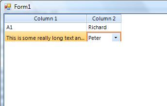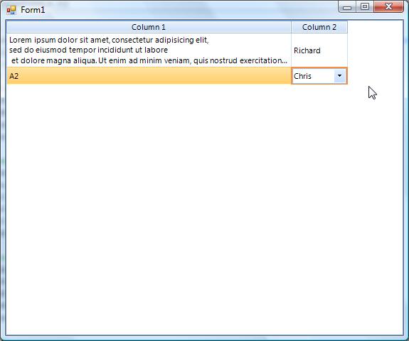 Imports Telerik.WinControls.UIPublic Class Form1 Private Sub Form1_Load(ByVal sender As System.Object, ByVal e As System.EventArgs) Handles MyBase.Load With RadGridView1 ' Set the desired default property values. ' Rows .AutoSizeRows = True .AllowRowResize = False .AllowRowReorder = False .EnableAlternatingRowColor = True .ShowRowHeaderColumn = False ' Columns .AutoGenerateColumns = False .AutoSizeColumnsMode = GridViewAutoSizeColumnsMode.None .AllowColumnChooser = False .AllowColumnResize = True .AllowColumnReorder = False .AllowDragToGroup = False ' Allow the user to directly edit the rows but not add or delete .AllowAddNewRow = False .AllowDeleteRow = False .AllowEditRow = True .EnterKeyMode = RadGridViewEnterKeyMode.EnterMovesToNextRow .AddNewRowPosition = Telerik.WinControls.UI.SystemRowPosition.Bottom ' Other .ShowGroupPanel = False .ShowItemToolTips = True .AutoScroll = True End With Dim people As New List(Of Person) people.Add(New Person(1, "Richard")) people.Add(New Person(2, "Peter")) people.Add(New Person(3, "Chris")) Dim column1 As New GridViewTextBoxColumn("Column 1") column1.Width = 100 Dim column2 As New GridViewComboBoxColumn("Column 2") column2.WrapText = True column2.FieldName = "Id" column2.DataSource = people column2.DisplayMember = "Name" column2.ValueMember = "Id" Me.RadGridView1.Columns.Add(column1) Me.RadGridView1.Columns.Add(column2) ' Populate the cells Dim rowInfo As GridViewRowInfo = Me.RadGridView1.Rows.AddNew() rowInfo.Cells(0).Value = "Lorem ipsum dolor sit amet, consectetur adipisicing elit," & Environment.NewLine & "sed do eiusmod tempor incididunt ut labore" & Environment.NewLine & " et dolore magna aliqua. Ut enim ad minim veniam, quis nostrud exercitation ullamco laboris nisi ut aliquip ex ea commodo consequat." rowInfo.Cells(1).Value = 1 rowInfo.MinHeight = 25 rowInfo = Me.RadGridView1.Rows.AddNew() rowInfo.Cells(0).Value = "A2" rowInfo.Cells(1).Value = 2 rowInfo.MinHeight = 25 End SubEnd ClassPublic Class Person Private m_Name As String Private m_Id As Integer Public Sub New(ByVal Id As Integer, ByVal Name As String) m_Name = Name m_Id = Id End Sub Public Property Name() As String Get Return m_Name End Get Set(ByVal value As String) m_Name = value End Set End Property Public Property Id() As Integer Get Return m_Id End Get Set(ByVal value As Integer) m_Id = value End Set End PropertyEnd Class0