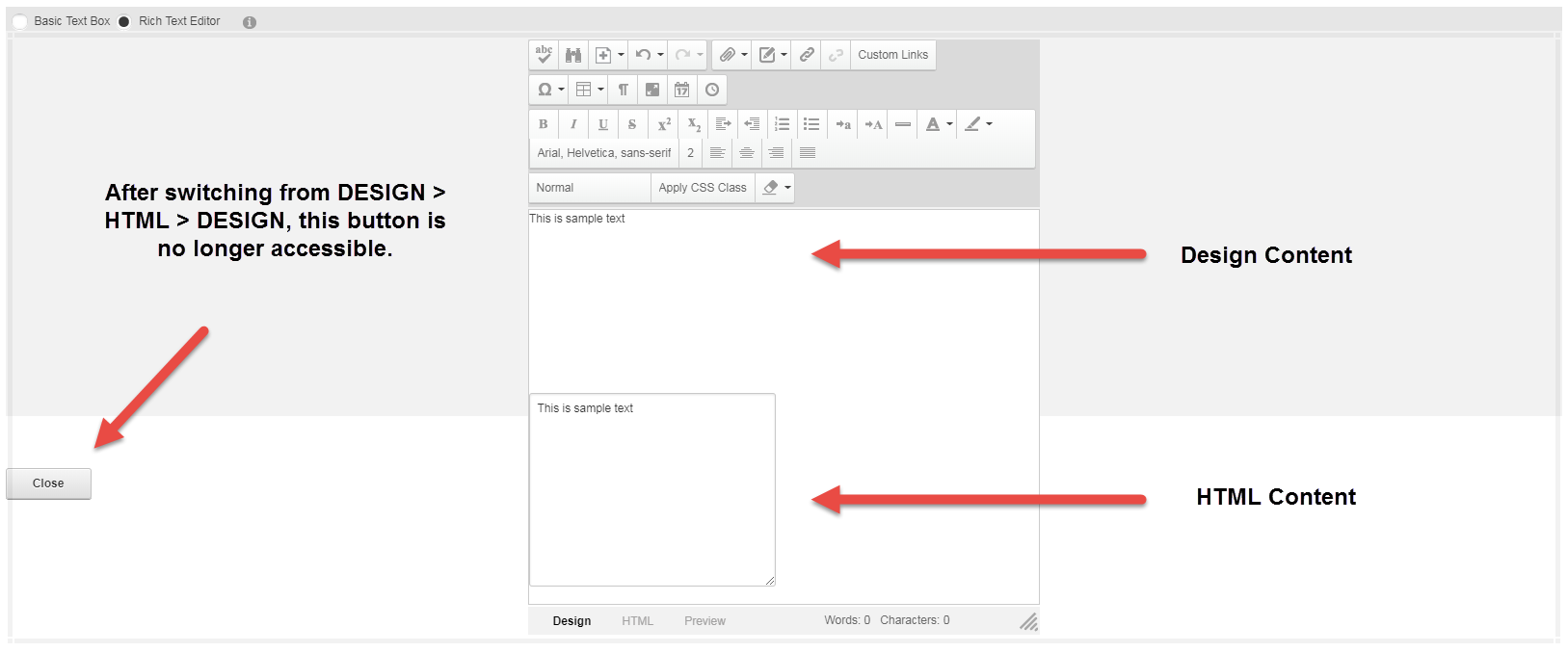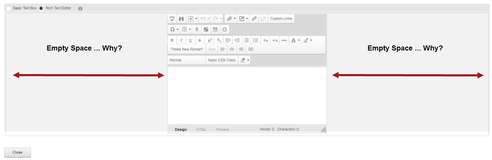 After upgrading to the latest Telerik binaries on our DotNetNuke (DNN v9.1.1) website, the RadEditor has some odd behavior making it near impossible to use. The RadEditor seems to be centered as a small square inside of a large gray box. Additionally switching between DESIGN and HTML modes causes the entire editor to freak out.