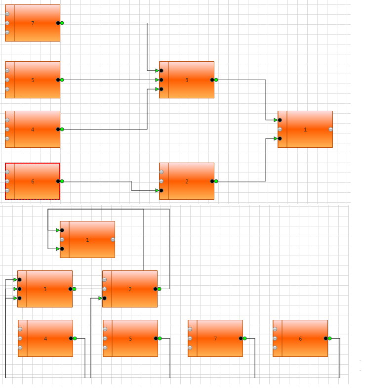 The user can drag from the "output" (right connector) to an input (not opposite).