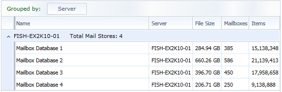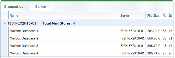 <Grid Grid.Row="1" DataContext="{Binding Product, ElementName=mThis}" Grid.Column="1"> <Grid.RowDefinitions> <RowDefinition Height="Auto"/> <RowDefinition Height="*"/> </Grid.RowDefinitions> <Border CornerRadius="5" Background="{StaticResource InformationHeaderBrush}" Margin="3" Height="25"> <Border Style="{StaticResource BorderGlossEffectStyle}" CornerRadius="5"> <TextBlock Text="Exchange Mail Stores" Style="{StaticResource TitleAreaTextStyle}"/> </Border> </Border> <telerik:RadGridView Grid.Row="1" ItemsSource="{Binding MailStores}" CanUserResizeColumns="True" HorizontalAlignment="Stretch" VerticalAlignment="Stretch" CanUserReorderColumns="True" CanUserDeleteRows="False" RowIndicatorVisibility="Collapsed" IsFilteringAllowed="False" AutoGenerateColumns="False" IsReadOnly="True" CanUserSortColumns="True" CanUserSelect="False" AutoExpandGroups="True" telerik:StyleManager.Theme="Windows7" Margin="3 0 3 0"> <telerik:RadGridView.GroupDescriptors> <telerik:GroupDescriptor Member="Owner" DisplayContent="Server"> <telerik:GroupDescriptor.AggregateFunctions> <telerik:CountFunction Caption="Total Mail Stores:"/> </telerik:GroupDescriptor.AggregateFunctions> </telerik:GroupDescriptor> </telerik:RadGridView.GroupDescriptors> <telerik:RadGridView.Columns> <telerik:GridViewDataColumn Header="Name" DataMemberBinding="{Binding Name}" Width="*"/> <telerik:GridViewDataColumn Header="Server" DataMemberBinding="{Binding Owner}"/> <telerik:GridViewDataColumn Header="File Size" DataMemberBinding="{Binding Size, Converter={StaticResource BytesToStringConverter}}"/> <telerik:GridViewDataColumn Header="Mailboxes" DataMemberBinding="{Binding Mailboxes}" DataFormatString="N0"/> <telerik:GridViewDataColumn Header="Items" DataMemberBinding="{Binding Items}" DataFormatString="N0"/> </telerik:RadGridView.Columns> </telerik:RadGridView> </Grid>