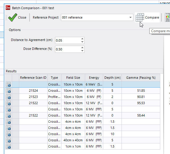 /// <summary>/// Calculate the gammas for the scans in the project/// </summary>private async Task GetScans(){ _reset?.Set(); _task?.Wait(); if (null != _projectViewModel) { // reference project name _referenceProjectName = _projectViewModel.Name; // what is the current analysis parameter protocol _protocol = (AnalysisProtocolType)_snc.Administration.GetPreference( PreferenceType.AnalysisProtocolType).IntValue; _model = new ComparisonScansViewModel(_snc, _protocol, _scans); if (null != _model) BatchComparisonGrid.DataSource = _model.Scans; UpdateWaitingBar(ElementVisibility.Visible, "Finding matches / Calculating Passing Percentage..."); // try to calculate match/gamma _task = Task.Run(() => { _reset = new ManualResetEvent(false); try { foreach (ComparisonScanViewModel scanModel in _model.Scans) { if (_reset.WaitOne(0)) break; scanModel.FindMatches(_snc.Measuring.GetProject(_projectViewModel.Id)); } } catch (Exception) { } finally { _reset?.Close(); _reset?.Dispose(); _reset = null; } }); await _task; } UpdateWaitingBar(ElementVisibility.Collapsed);}