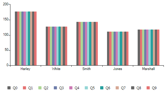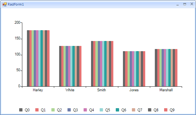 public RadForm1(){ InitializeComponent(); for (int i = 0; i < 10; i++) { BarSeries barSeries = new BarSeries("Performance", "RepresentativeName"); barSeries.LegendTitle = "Q"+i; barSeries.DataPoints.Add(new CategoricalDataPoint(177, "Harley")); barSeries.DataPoints.Add(new CategoricalDataPoint(128, "White")); barSeries.DataPoints.Add(new CategoricalDataPoint(143, "Smith")); barSeries.DataPoints.Add(new CategoricalDataPoint(111, "Jones")); barSeries.DataPoints.Add(new CategoricalDataPoint(118, "Marshall")); this.radChartView1.Series.Add(barSeries); } this.radChartView1.ShowLegend = true; this.radChartView1.ChartElement.LegendPosition = LegendPosition.Bottom; this.radChartView1.ChartElement.LegendElement.StackElement.Orientation = Orientation.Horizontal;}I hope this information helps. If you have any additional questions, please let me know.
