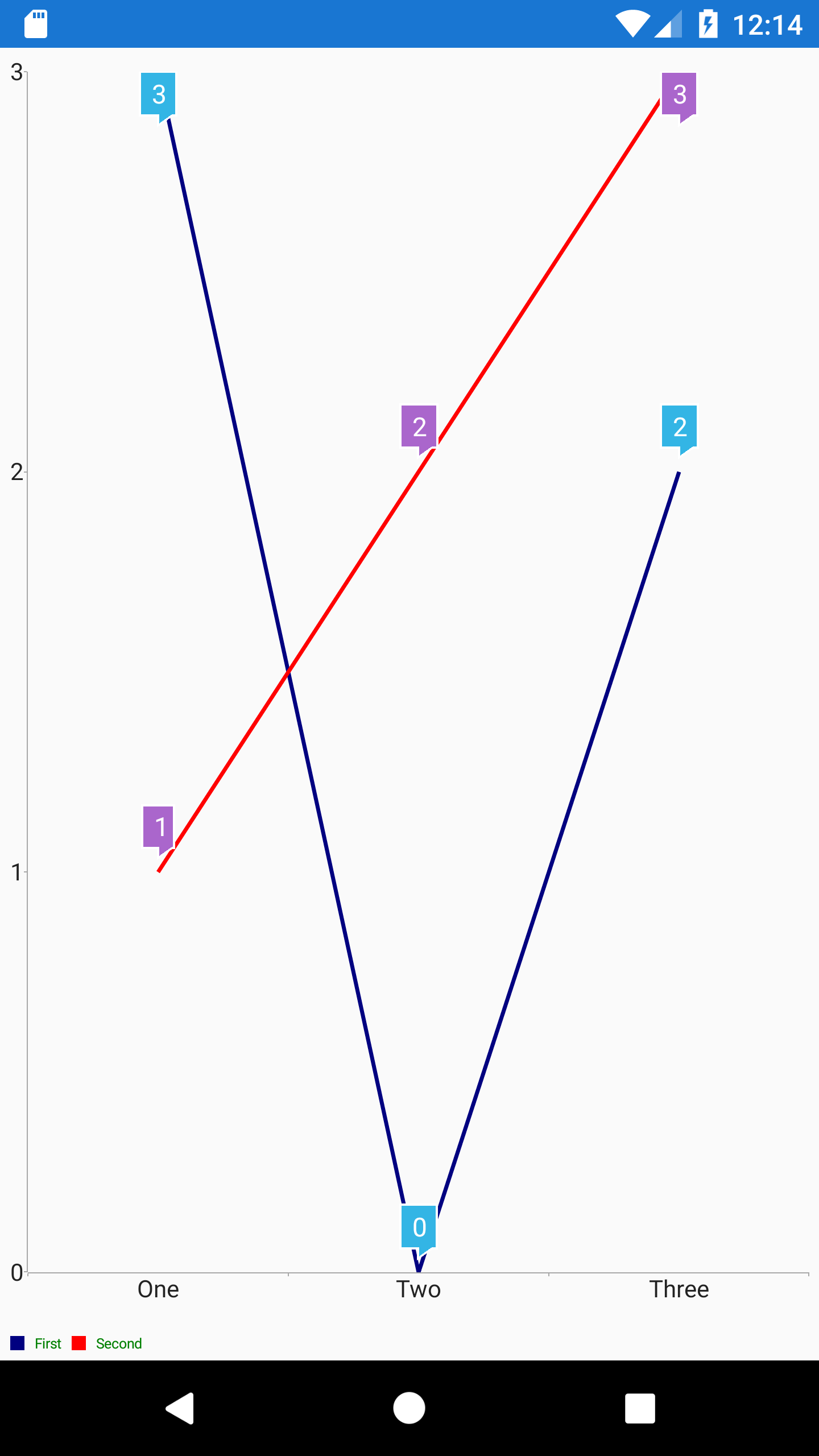 <?xml version="1.0" encoding="utf-8" ?><ContentPage xmlns="http://xamarin.com/schemas/2014/forms" xmlns:telerikChart="clr-namespace:Telerik.XamarinForms.Chart;assembly=Telerik.XamarinForms.Chart" xmlns:local="clr-namespace:ChartLegendBug" x:Class="ChartLegendBug.MultiSeriesChart"> <ContentPage.BindingContext> <local:MultiSeriesViewModel/> </ContentPage.BindingContext> <Grid> <Grid.RowDefinitions> <RowDefinition Height="*"/> <RowDefinition Height="Auto"/> </Grid.RowDefinitions> <telerikChart:RadCartesianChart x:Name="Chart"> <telerikChart:RadCartesianChart.HorizontalAxis> <telerikChart:CategoricalAxis ShowLabels="True"/> </telerikChart:RadCartesianChart.HorizontalAxis> <telerikChart:RadCartesianChart.VerticalAxis> <telerikChart:NumericalAxis Minimum="0" MajorStep="1" Maximum="3" ShowLabels="True"/> </telerikChart:RadCartesianChart.VerticalAxis> <telerikChart:RadCartesianChart.Series> <telerikChart:LineSeries ItemsSource="{Binding Series1Data}" ShowLabels="True" Stroke="Navy" DisplayName="First"> <telerikChart:LineSeries.ValueBinding> <telerikChart:PropertyNameDataPointBinding PropertyName="Value"/> </telerikChart:LineSeries.ValueBinding> <telerikChart:LineSeries.CategoryBinding> <telerikChart:PropertyNameDataPointBinding PropertyName="Category"/> </telerikChart:LineSeries.CategoryBinding> <telerikChart:LineSeries.LabelBinding> <telerikChart:PropertyNameDataPointBinding PropertyName="Value"/> </telerikChart:LineSeries.LabelBinding> </telerikChart:LineSeries> <telerikChart:LineSeries ItemsSource="{Binding Series2Data}" ShowLabels="True" Stroke="Red" DisplayName="Second"> <telerikChart:LineSeries.ValueBinding> <telerikChart:PropertyNameDataPointBinding PropertyName="Value"/> </telerikChart:LineSeries.ValueBinding> <telerikChart:LineSeries.CategoryBinding> <telerikChart:PropertyNameDataPointBinding PropertyName="Category"/> </telerikChart:LineSeries.CategoryBinding> <telerikChart:LineSeries.LabelBinding> <telerikChart:PropertyNameDataPointBinding PropertyName="Value"/> </telerikChart:LineSeries.LabelBinding> </telerikChart:LineSeries> </telerikChart:RadCartesianChart.Series> </telerikChart:RadCartesianChart> <telerikChart:RadLegend Grid.Row="1" HorizontalOptions="FillAndExpand" VerticalOptions="FillAndExpand" x:Name="Legend" LegendProvider="{x:Reference Name=Chart}" LegendItemFontColor="Green" LegendItemFontSize="7" Orientation="Horizontal" /> <!-- LegendItemIconSize="7,7" --> </Grid></ContentPage>