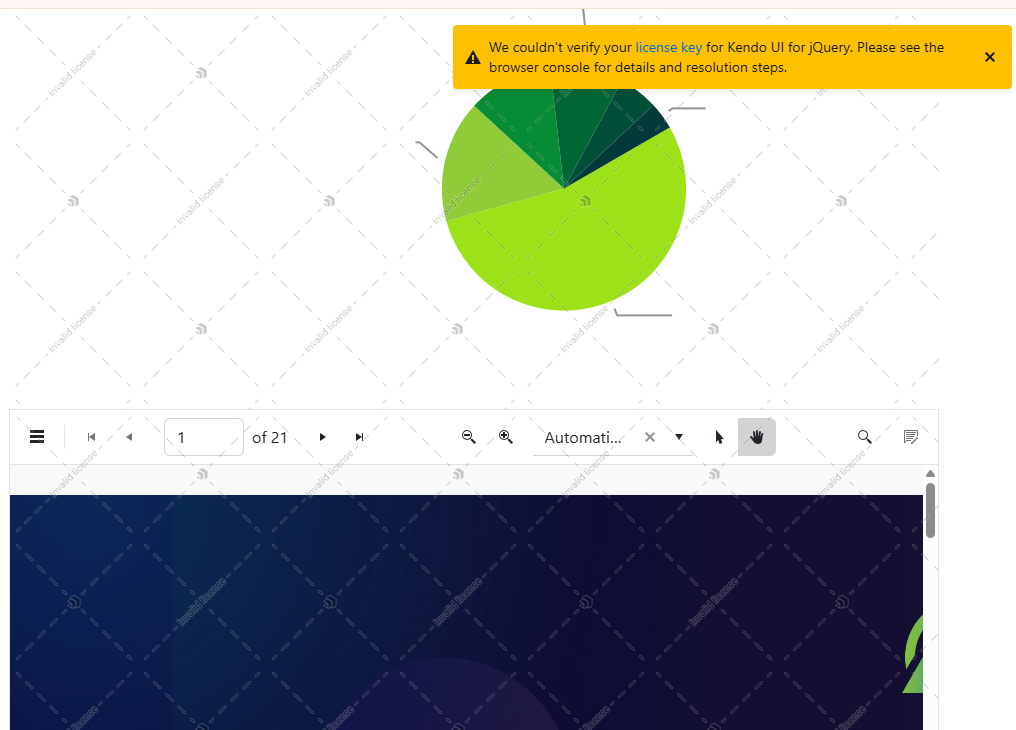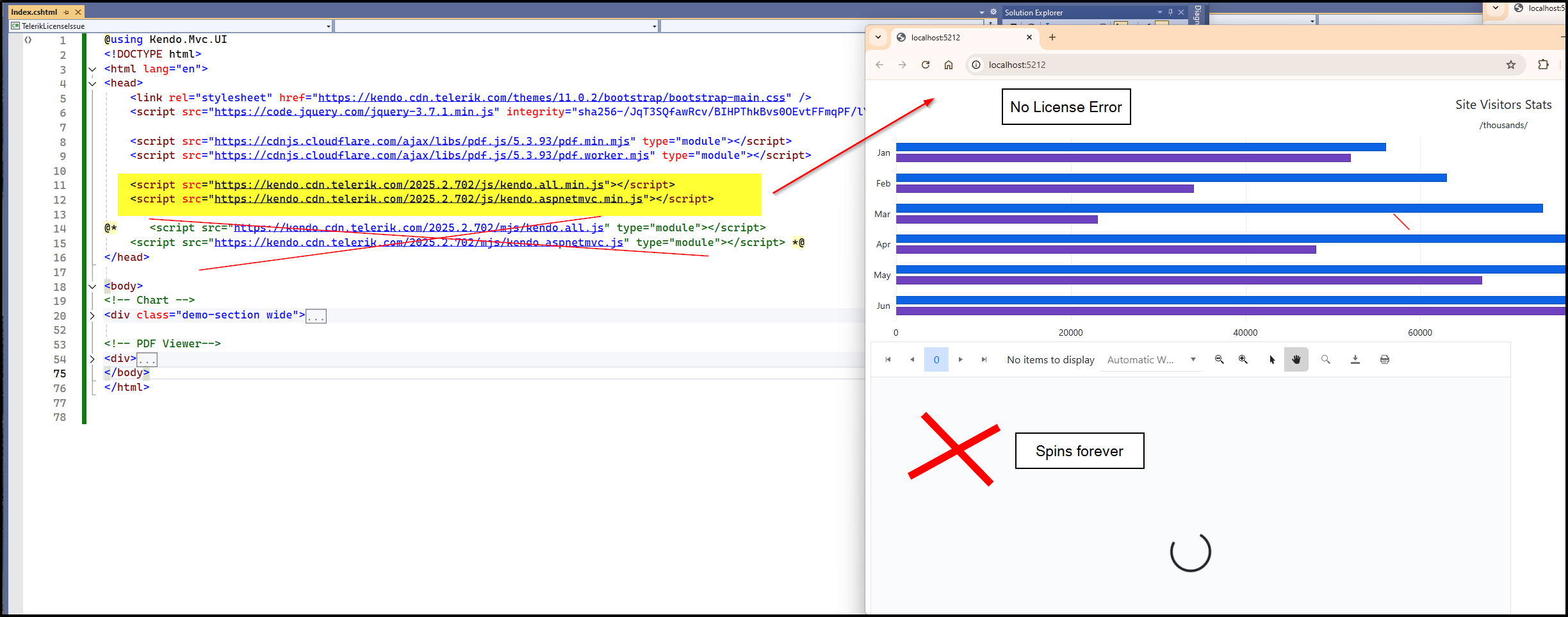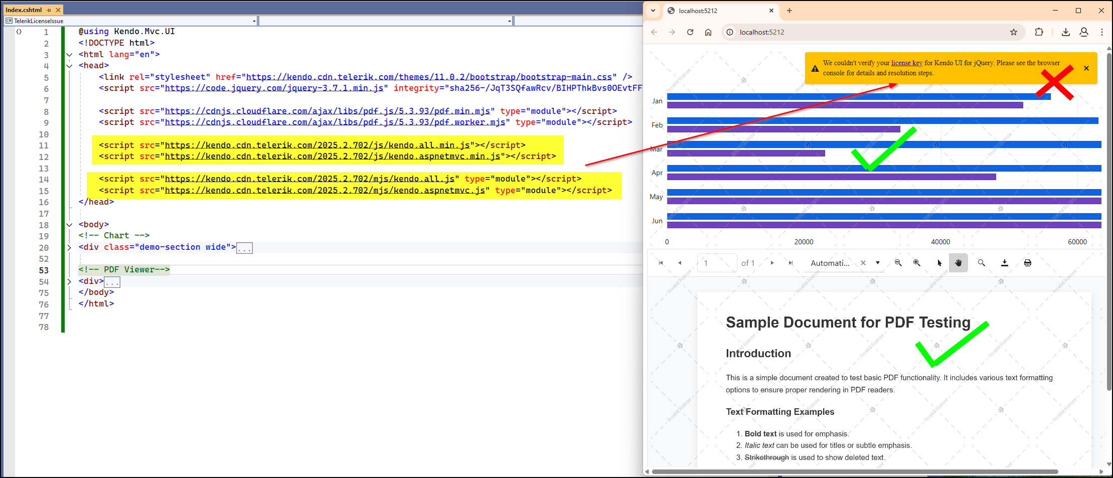 Below is how I have tried loading the Kendo library at the top of the page. For the chart, I need to load it as a script for it to work. For the PDF Viewer I need to load it as a module. But loading both always breaks the license. I have tried version combinations (see below)