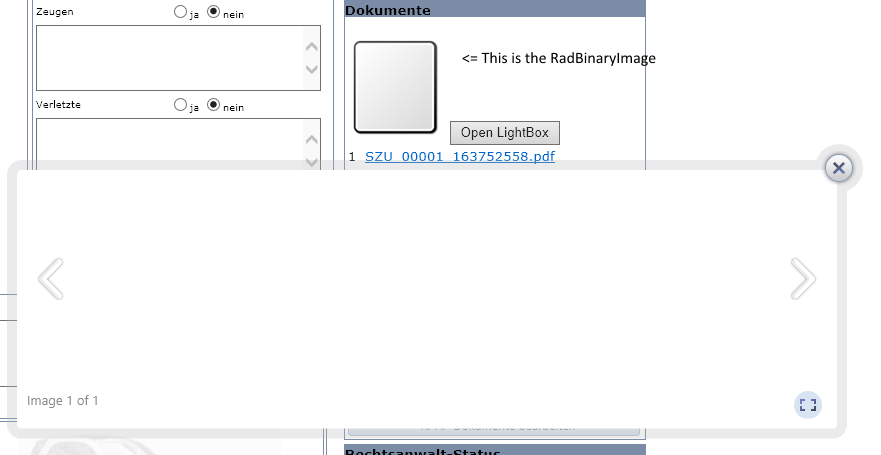 protected void Page_Load(object sender, EventArgs e) {[...] List<RadLightBoxItem> itemsList = new List<RadLightBoxItem>(); byte[] imageData = Convert.FromBase64String("iVBORw0KGgoAAAANSUhEUgAAAIAAAACACAYAAADDPmHLAAAABGdBTUEAAK/INwWK6QAAABl0RVh0U29mdHdhcmUAQWRvYmUgSW1hZ2VSZWFkeXHJZTwAAApnSURBVHjaYvz//z/DKBi5ACCAmEaDYGQDgAAaTQAjHAAE0GgCGOEAIIBGE8AIBwABxEKKYkZGRhS+h4cH49+/f8OYmJjCgHIWQCFekLLRYKU9+Pfv372fP38e+vDhw/KLFy+eBwr9AGKUFj0xDXyAAGIkpReAnADc3Nw0gfxpQKbDr1+/GH7//s0w2qOgD2BmZmZgY2NjYGFhASWEL58+fZp34sSJDqDUGyD+TUoCAAggshKAq6urGTDXbwBGvCQrKyuDnp4eg4aGBgOIPQpoD16/fs1w7tw5hidPnjBwcHAwAOOCAZgIdh87diwLKP0YiH8SmwAAAojkBODi4iIOtPAwsPhRlZeXZ8jOzmYwNjYGp8pRQD/w9u1bhmXLljGsX78eXBKAEsHLly9XXrhwoQYo/RBUEhATtwABRE4jsAqY88GR397ezmBmZjZiIx8UwOgYlzg1MQgICwsz5ObmMiQmJjKAqmBgVcAgIiISJCYm5gWUFiG2LQYQQCQ1Ap2cnCSBDogDRXhOTg6DlJQUzoAhV4xYtaDSiB72DCa18EgD5nhOTk5wro+NjWW4evUqA7D4B4mxSkhIhL169eoMUNkHIP5OKE4BAojUEsAJ2NgTANX5pqamVI985BROSC0oxaPnDGLFaKUWJEZLtTAMrH4Zvn79Cg8XPz8/WIOQgYeHRx0opAztkREEAAHERGKRpwMqbkANPlrkfGLNpEQdNdTS0y5cbTFQPIAwCIDig5ubmwHYJWdgZ2cXAApJEZsAAAKIpAQATGGcIEeCuiADUezjEqdnUTyYqggYDYoPUHWABPiAmIOYOAUIIBYSS4C/2Irp0cgfWLXoDUQgYCU2cwMEEAuJJcB/9AQwGvmDo3GIFi9E1zsAAUT1uYDRyB94d5ECAAKI1CqAYCocjfyBcRehuMEFAAKIaTTnj8ycDwMAAURWCUBuI3A08mnrLnISBkAAsVCa00cjf3DkfHITAEAAMVGaAEYjf+gV+8gAIICoUgWMRj793UWtRiBAANG0ETga+fSJfEoAQABRpRs4GvkDG/mESmZ8ACCAKK4CRiN/cOR8chMAQADRZFXwaOQP7mIfGQAEEFVHAkcjn/7FPqUlAEAA0bwXMBr59Mn55CYAgABioUYxQmm3cDTy6TPqhw0ABBATOSUANRPFaOSTZyb6Jh1yEwVAADHRIvePRj5tI5+aACCAqNoGGI38gYt8cksAgACi+XqA0cinj1vJTQAAAUT3oeDRyKeOmdQaKwAIILIageRG6mjk09Z+ckoBgABiGs35Qz/yKQEAAUSTbuBo5NM/8sktAQACiKwFIaQ0BEcjnz72k5sAAAKIqpNBo5H/n25mUqs6AAggmq0HGI38obEuECCAqNILGI38wRP5pCYAgACiei9gNPKH1qJQgACiai9gNPIHLvLJLQEAAohqVcBo5A+sX8lNAAABRJV9AaORP/B+JRcABBBd1wOMRj5t5wbIKQEAAmjQLQodjXz6rgcACCCqdwNHI39gIp/cEgAggGjeCxiNfNpFPjWGggECaFAsCh2NfOqsByAHAAQQxVXAaOQPHr+SkzAAAohujcDRyB+c6wEAAojq3cDRyB9a6wEAAoiqvYDRyB+4nE9uAgAIoEFzPsBo5A/MmABAAFGlChiN/MHhV3JKAIAAonhJ2GjkD46cT24CAAigAR0KHo38gR8KBgggptHIH7mRDwIAAUTqYdHwCw1GI39wFPvocUMqAAggug8Fj0b+4BoKBgggug4Fj0b+4BsKBgggJlrkfFqZMZSumhlou4gFAAE0onsBw2EpG6UAIIDIagSORv7gi3xyG4EAAcREzaJsNPIHz92CxAKAAKLouHjYQUVDqSE4GvmoACCAKJ4LGI38wdULIBUABBBF3cDRyB98XUBSEwFAAA3ZW8NGI586ACCABv2q4NHIJ317GCkAIIBodmnUaOQPTOSTmgAAAohuh0SNRv7gHBACCCC6HBI1Gvm0j3xySwCAAKJLI3A08gfvUDBAAA2qVcGjkU//vYEAAcREyxw+Gvn0U0tuAgAIIKpUAaORP3THBAACaMgvCBmNfMpKAIAAGjIHRIxGPm0agQABRJe9gaORP3j3BgIEEM17AaORT5/jYslNAAABNKgPiBiNfNpXBQABNOC3ho1GPvXcRU4JABBANOkFjEb+0DkrGCCAhsRQ8Gjk0249AEAADfqzgkcjn7YjgQABNKjPCh6NfNJ7BaQmAIAAGrRDwaORT5+qACCASC4B0DcfjEb+4Ih8cksAgAAadEPBo5FP30YgQAANqrOCRyOf/qeEAQTQoFkVPBr51LkyjtQEABBAg2IoeDTyB25pGEAAUf3iyNHIH5jIJ7cEAAggmiwLH438wZ/zYQAggJgojezRyB+YyKfWdDBAAJGVAEbr/MGX88lNAAABRPezgkcjf3AtDQMIICZaRPJo5A+MW8kpAQACiOIqYDTyB0fOJzcBAAQQXYaCRyN/8J4PABBANO8FjEY+fc0kNaEABBDTaM4fmpFPrRIBIIBYyIlgYiJ6NPJpaybshDZKEwVAAFG9ChiNfPr7lZJGIEAAUX0oeDTyh9aiUIAAGpCRwNHIp36Dj9wSACCABs2tYaORPzATQwABRNeRwNHIp61+ckoAgACiahUwGvkDl/PJTQAAATRkzgcYjXzaNAQBAojqJcBo5A9M5JNbAgAEEKklAHj0gYmJaTTyB0Hkw/ZowOKDnAQAEECkLgoFm/79+3f4aBQIj14mPTANPhYWSPSB4uPPnz8YGZUYABBApF4ZcxNEnzhxAi7GwcHB8PnzZ3iCoKbHQZiQmYTUol9wQezeRlLU0jtR//37l4GLi4uBh4cHzD916hTDly9fwG4GxtFXoNBvUHQRE6cAAUTqXMA+oCWfjx49yrtz504Gd3d3cAKApUJYkYQeGeQCUszApRabOLZxdGL1E+M35MRHTqbApxZkHijiRUREGJiZmcFiU6dOBScKUIkAjIOXQKWfgPgHMeEGEECklgCPgZZuBhY3UTk5OQzbt29nUFFRAScCEAY5Al8gYROn1/VopI5tDFYAinTkNlhTUxPDrl27wGJAv/wB4htA4WdA/JkY8wACCGNXCT4MyRCM+kDLQBb8V1VV/b9ly5b/wATxfxTQFzx9+vR/VlYWKFL+A+PkPzBh/AfGy3UgvwOIrYCYk5g4BQggRlJyADT3cgDpUCCeAiwR+EAC9vb2DObm5gxsbGwMo4D24MmTJwx79uwB07BeADAeHwPxTiB3LxAfBOIX/4mIXIAAIicBgAh+IDsASNcB9SuORsnAAGh8gBp8d4DxcATUPgfiQ0D8ECROTNwCBBA5CQA2fiAIxNpAsSQgbQ3E0kCzWEejhW6RD2rtvwSGOahndg2ILwDxGSB+DMQ/iW3fAAQQuQkAVhJwgyIeiFWBWB6IRUB1Dyn90FFANvgDbe2D2mN3gfg+EL+BlghEN3ABAoiSBIDckwAlBH4g5oLyRxMA7cE/aE7/jNTt+09qDwcggBiHWjdoFFAXAAQQ02gQjGwAEECjCWCEA4AAAwBhKO42ZcdZ+AAAAABJRU5ErkJggg=="); RadLightBoxItem my_item = new RadLightBoxItem(); my_item.ItemTemplate = new LightBoxTemplate(imageData); my_item.Description = "The default image"; my_item.ImageUrl = "~/images/test.png"; binaryDemoImage.DataValue = imageData; binaryDemoImage.Width = 100; binaryDemoImage.Height = 100; binaryDemoImage.ResizeMode = BinaryImageResizeMode.Fit; itemsList.Add(my_item); log.Debug("Bild " + my_item.Description + " zur RadLightBox dazu."); RadLightBox1.DataSource = itemsList; RadLightBox1.DataBind();[...] }With: