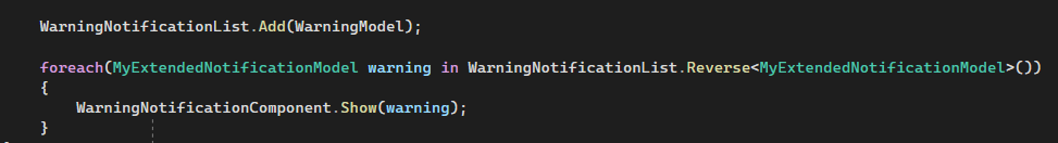 var reversedNotifications = NotificationsContainer.Reverse<NotificationModel>().Take(5); //take last 5 notificationsforeach (var notification in reversedNotifications)