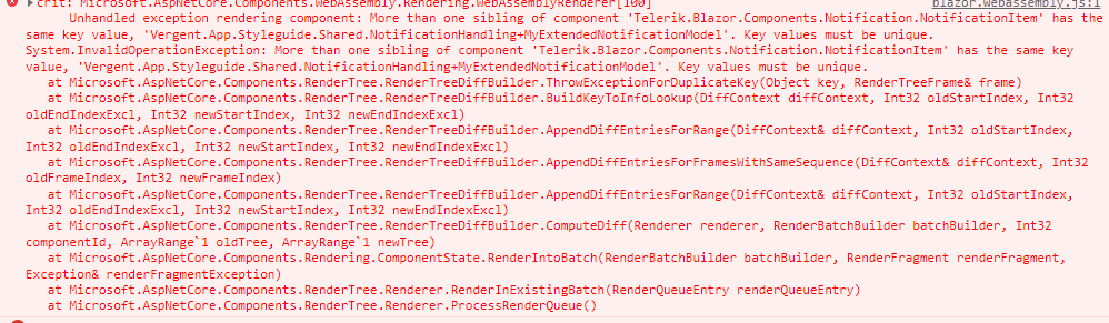 If you implement a kind of queue for your notifications, trigger the show event for each notification in the queue on a new enqueue event and one (or more) existing notifications are already shown, then the error is raised because the telerik notification tries to reredner an already shown notification with the same key.