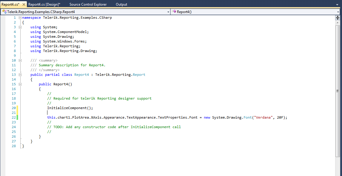 I've attached a screenshot that shows the line of code we added after InitializeComponent in the Report.cs file.