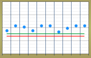 The chart monitors quality, so it checks how the item performed (point) against two levels of standards (the lines). The problem is that with a new run we'll have the single performance data in there which shows up fine, but the two lines don't show up at all. I assume that this is caused by the lack of multiple data points resulting in no line being drawn from A to B since B doesn't exist.
