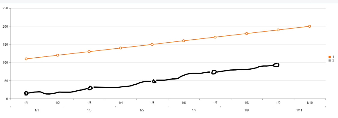 I have two series of objects (with date and value field - date is the category), which starts and ends at the same time, but one serie has only every other value. We measure one values in some interval (for example day) and other in double the interval (every two days).
