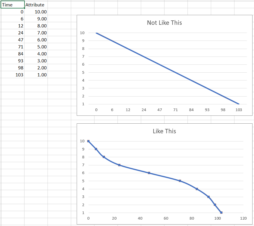 I am having a peculiar issue that may not even have a solution at least in regards to a Kendo UI chart property for Vue. The issue is that given a set of data points the chart is supposed to show a curve (the data is basically showing a degradation curve). Instead of a curve, the chart is display a straight line. I am not sure if there is a setting for the chart that can force the curve or if it needs to happen as a result of some kind of algorithm/calculation on the data itself. I have attached an image showing what the chart is essentially doing and what it needs to be doing. Any insight into this would be extremely helpful and appreciated. Thanks.