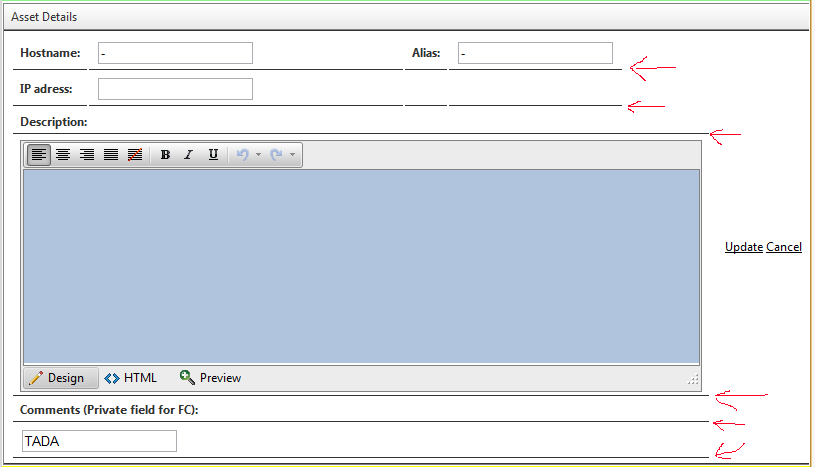 <EditItemTemplate> <table style="width: 740; border: 0px solid White;"> <tr> <td style="font-weight: bold;"> Hostname: </td> <td style="width: 300px"> <asp:TextBox runat="server" ID="hostname" /> </td> <td style="font-weight: bold;"> Alias: </td> <td> <asp:TextBox runat="server" ID="alias" /> </td> </tr> <tr> <td style="font-weight: bold;"> IP adress: </td> <td> <asp:TextBox runat="server" ID="ip" /> </td> <td> </td> <td> </td> </tr> </table> <table style="width: 740; border: 0px solid White;"> <tr> <td style="font-weight: bold;"> Description: </td> </tr> <tr> <td> <telerik:RadEditor runat="server" ID="telerikDesription" ToolsFile="/telerikEditorToolsTiny.xml" Height="250"> <Modules> </Modules> </telerik:RadEditor> </td> </tr> <tr> <td style="font-weight: bold;"> Comments (Private field for FC): </td> </tr> <tr> <td> <asp:TextBox runat="server" ID="comments" /> </td> </tr> </table></EditItemTemplate>It's not browser related, cause I tested on 4 different kinds, same result.