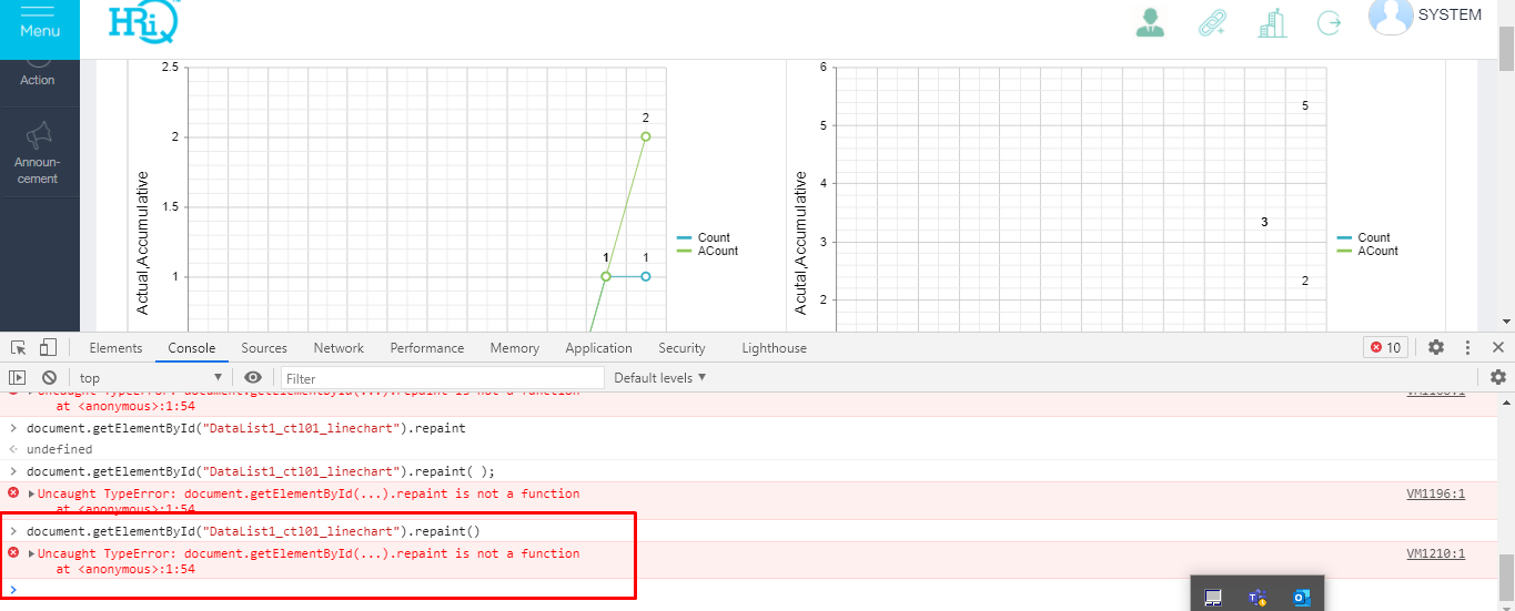 The repaint() method is part of the client-side object of RadHtmlChart thus it cannot be accessed through its html element: