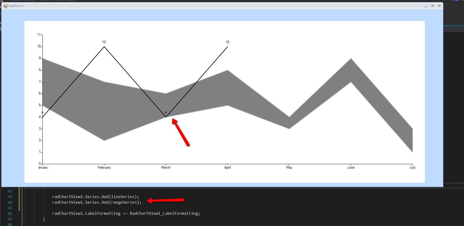 I have attached a couple of screenshots that show the result on my side as well. Please note that a transparent color is used for the area by default. If you are using a custom one you could set its transparency. This is demonstrated in the sample project. You can test by adding the line series first.