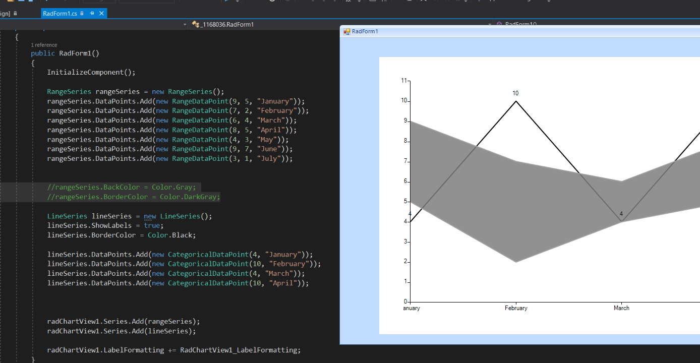 rangeSeries.BackColor = Color.Gray;rangeSeries.BorderColor = Color.DarkGray;I hope this will be useful.
