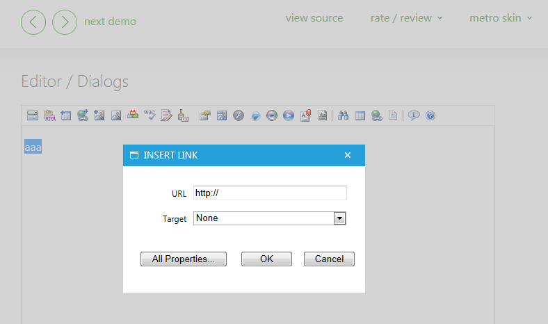 1) Go to one of your demo page: http://demos.telerik.com/aspnet-ajax/editor/examples/xhtmlvalidatortrackchangesformatcodeblockdialogs/defaultcs.aspx