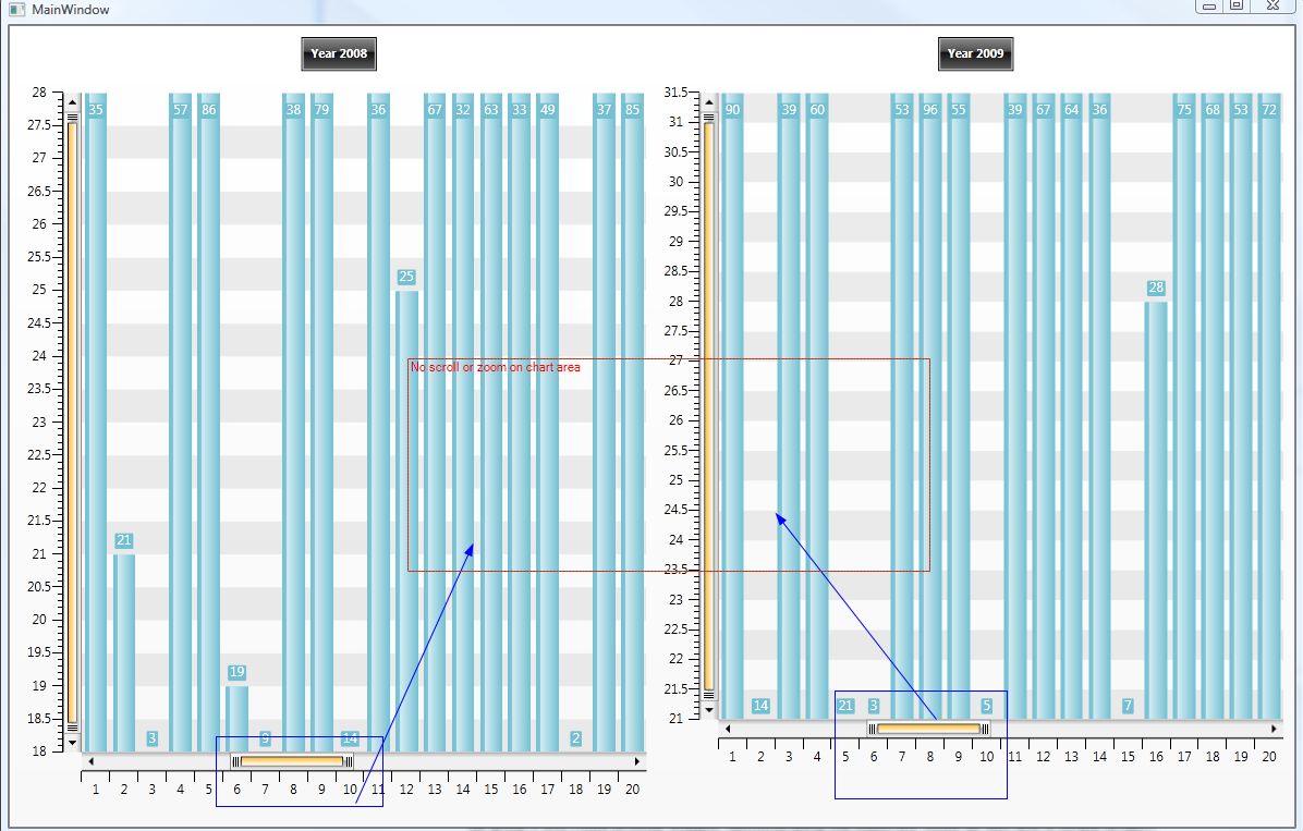 Some words about the project - there is a single Chart with Multiple Chart Areas. The XAxes of the two ChartAreas are set to one and the same ZoomScroll setting, while the YAxes have 2 different ZoomScroll settings.