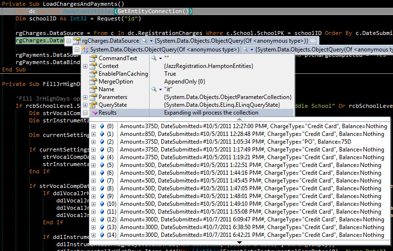 Select New With {.ProgramName = p.Name, .GroupName = g.Name, sr.Active, sr.Attended, sr.DropOutDate, sr.ConfirmDate, sr.SessionID, s.Name, s.SessionNo, s.StartDate, s.EndDate}